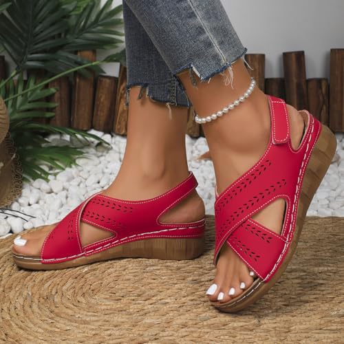 Women's Perforated Leather Sandals | Leaf Cut-Out Design & Adjustable Velcro Strap | Cushioned Wedge Heel Summer Casual Sandals Shoes